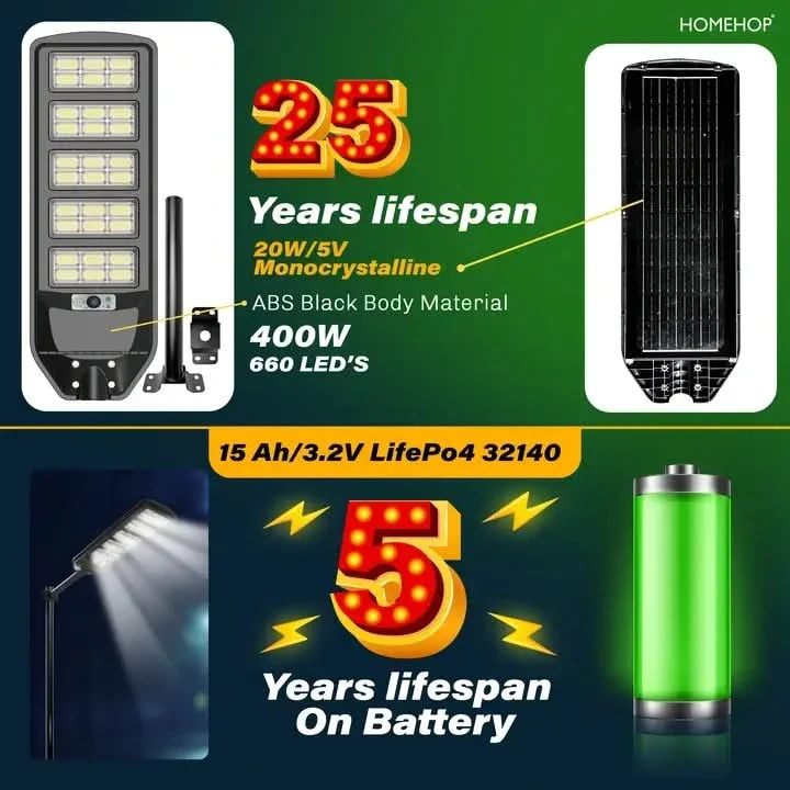 Upgrade your outdoor lighting with the powerful and efficient 400W Solar LED Street Light. Engineered for maximum brightness and wide-area coverage, this light is perfect for enhancing security and visibility around your home, garden, driveway, or pathway. It runs entirely on solar power, providing an eco-friendly, cost-effective lighting solution without any complicated wiring.