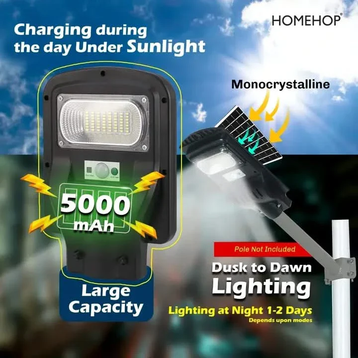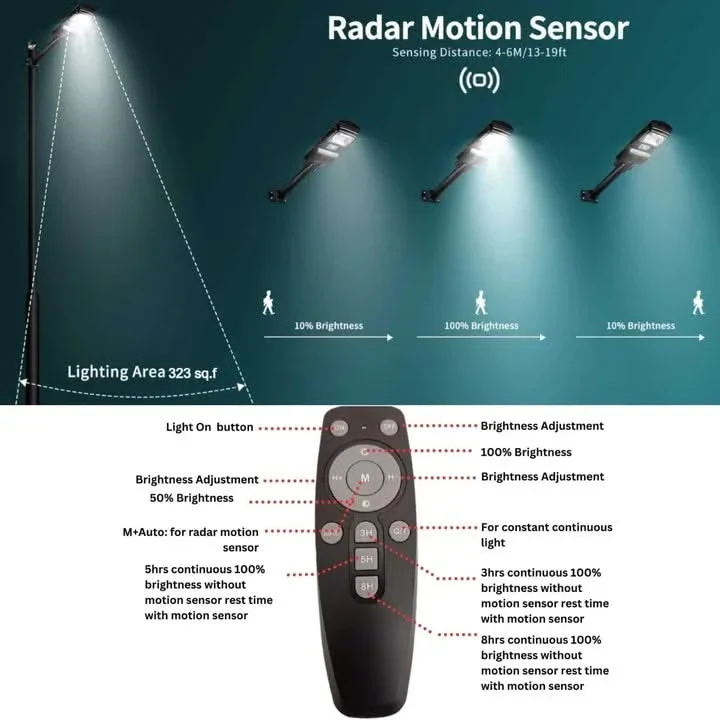 The waterproof, dust-proof construction (typically IP65-rated) ensures reliable outdoor performance even during monsoons or dusty conditions. The motion sensor detects movement and switches the lamp to full brightness, then dims when no movement is detected, thereby conserving battery power and extending lifespan of the unit. Remote control lets you pick modes (constant, timer, motion-triggered), adjust brightness levels and turn it on/off without climbing the pole.