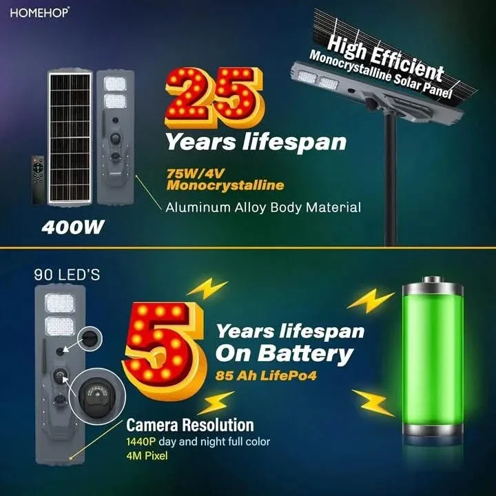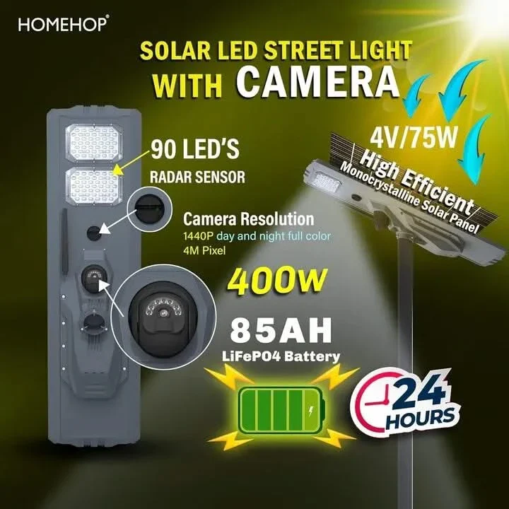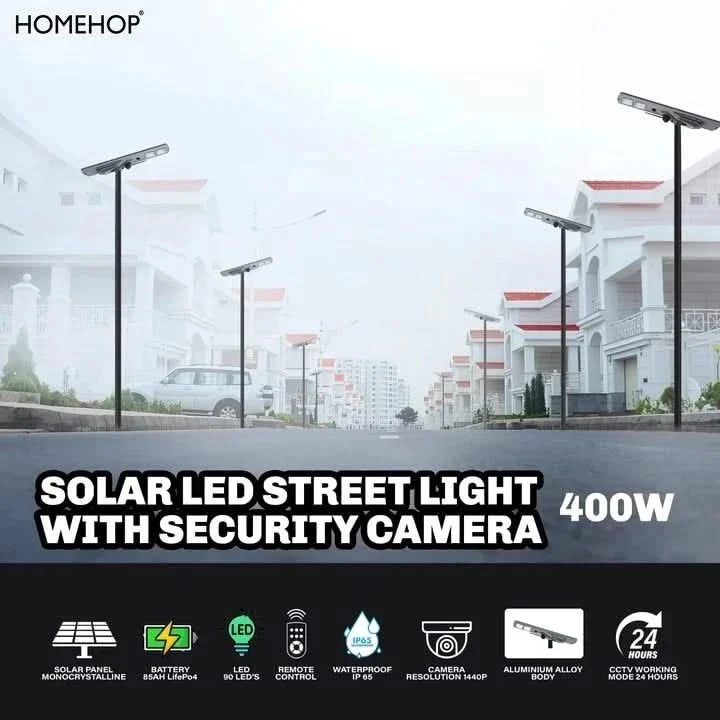 Light up and protect your surroundings with this advanced 400W Solar Street Light, equipped with a built-in CCTV camera and motion detection. Designed for all-weather outdoor use, this smart lighting solution is perfect for homes, gardens, building exteriors, rural roads, and public spaces.