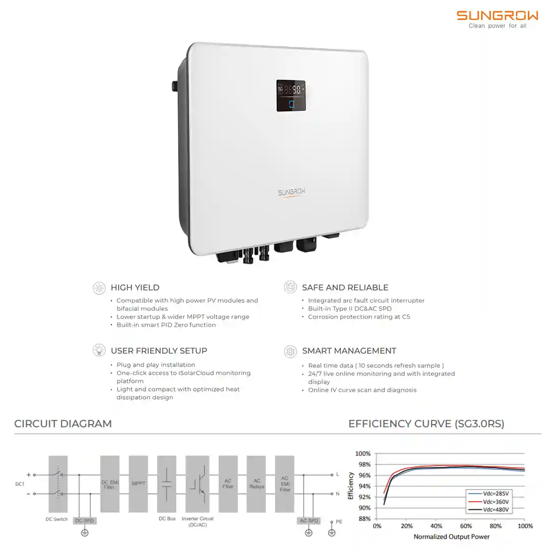 With high conversion efficiency and reliable protection features such as arc fault circuit interruption (AFCI), surge protection, and integrated Type II SPD, the SG3.0/3.6/4.0RS ensures long-term safety and consistent energy output. The inverter also supports remote firmware updates for enhanced system longevity and lower maintenance needs.